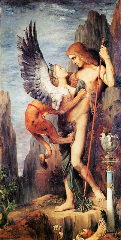 Mitolojik figürlere odaklanmış olan Fransız sembolist ressam Gustave Moreau, bu mitolojiyi 1864’te Paris’te yağlıboya çizimi ile “Oidipus ve Sphinks (Sfenks)” adı ile resmediyor. Günümüzde bu tablo Paris Metropolitan Müzesi’nde sergileniyor: